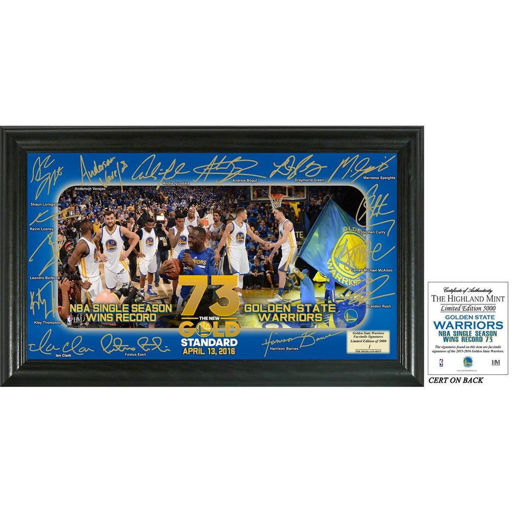This 12in x 20in wood frame with a glass front panel features a 10in x 18in photo of the Warriors celebrating after setting the new NBA single season wins record with 73. The perimeter of the photo features each Warriors players facsimile signature (exact replica). A limited edition of only 5000 each signature gridiron photo is individually hand numbered on the bottom righthand corner. Officially licensed by the NBA a certificate of authenticity also accompanies each collectible frame. Proudly made in the U.S.A. by The Highland Mint!