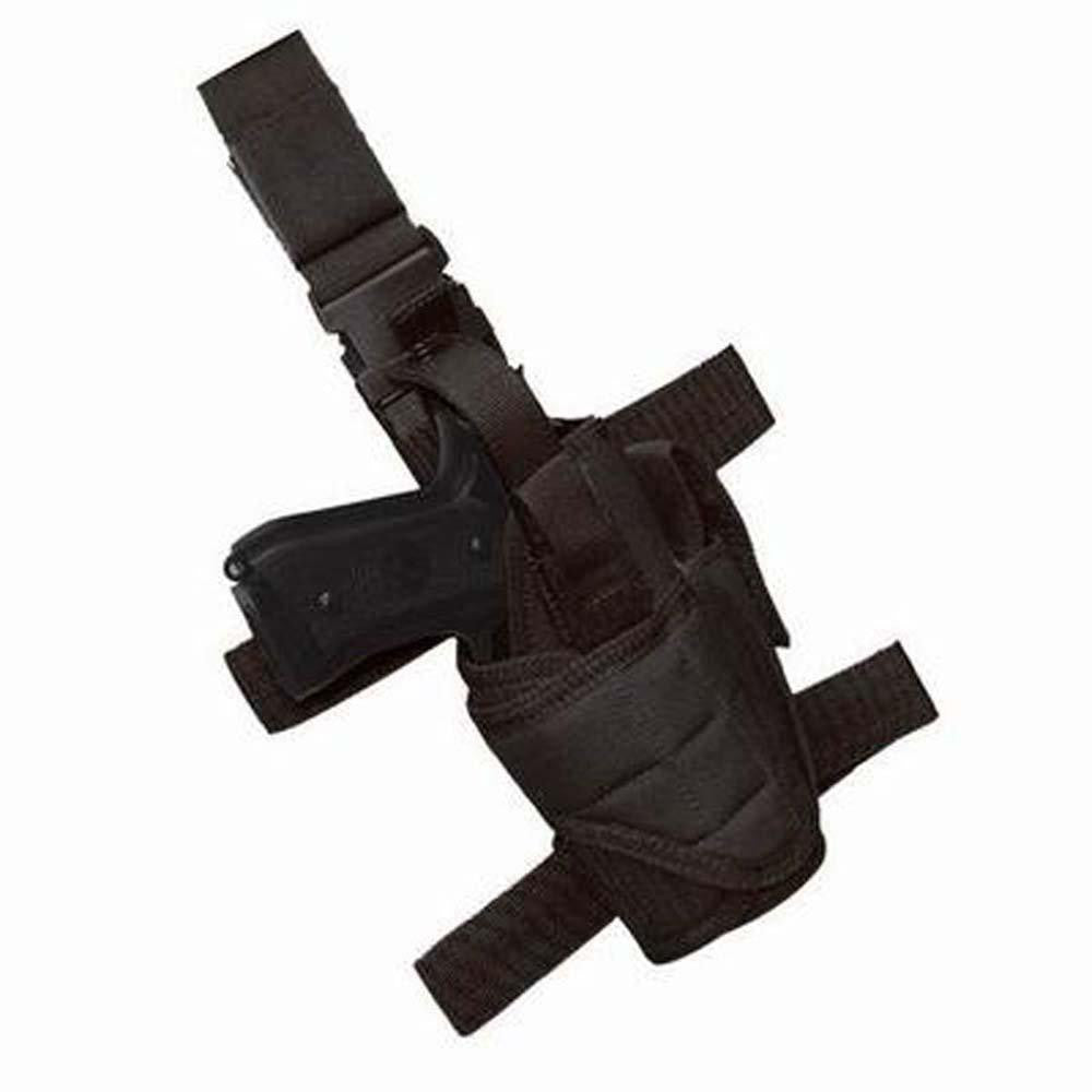 Wrap-Around design to fit pistols with laser or flashlight mount. Retention system with additional hook and loop strap to secure weapon. Fully adjustable leg strap with non-slip rubber lining and quick release buckle. One magazine pouch, with adjustable hook and loop flap. Will fit Medium or Large size pistol.