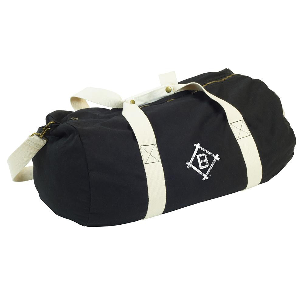 Screenprinted team logo. Black fabric with distressed logo and retro styling. Dual handles and removable shoulder strap. Dimensions: 22 x 9 x 12. Cotton material. Case packs of 6.