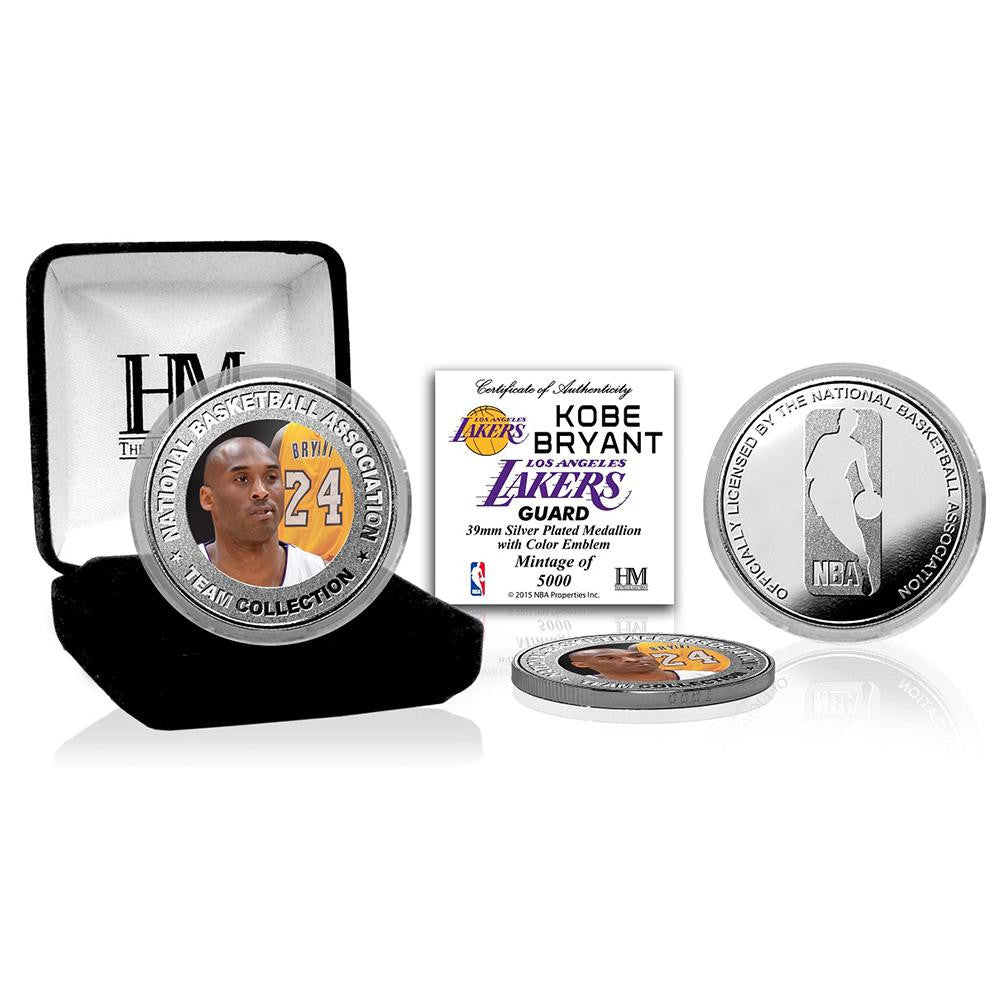 Limited edition! Kobe Bryant's color image is embedded in the center of this 39mm minted commemorative coin. Each silver plated coin is protected in a clear capsule to preserve its condition and delivered in a black velour jewelry display box. A limited edition of only 5000, each mint coin is individually struck with a serial number on its edge and accompanied by a certificate of authenticity. It is officially licensed by the NBA and proudly made in the USA by The Highland Mint.