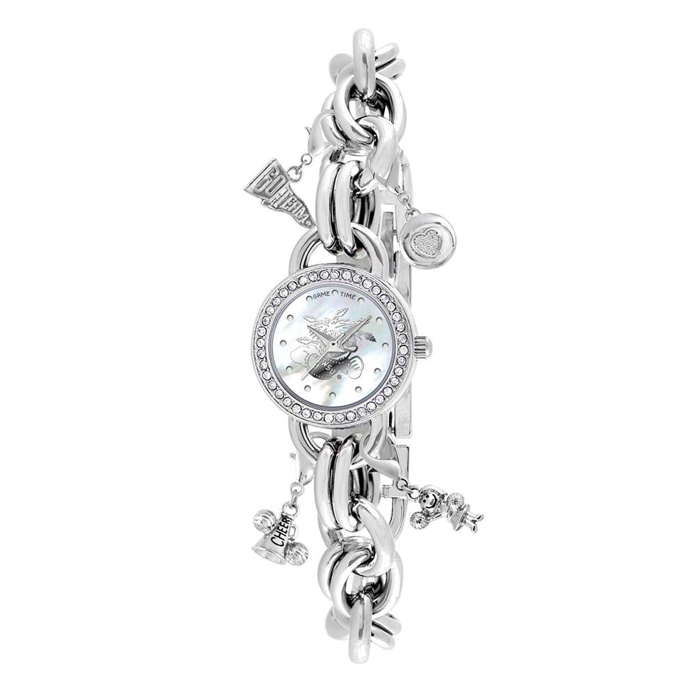 Designed specifically for the lady fan, the Women's Charm Watch by Game Time is definitely full of appeal. The silver tone team logo looks beautiful on the pearl dial, while the league charm adds to its unique look. Made with a durable stainless steel band and scratch resistant lens, this watch is perfect for game day or everyday wear! Features: Officially licensed team logo. Silver tone inlay and team logo on dial. Stainless steel band. Precision quartz movement. Mother of pearl dial. Applied crystal indexes. Scratch resistant mineral crystal lens. Stainless steel caseback. Water/shock resistant to 3 ATM. Limited lifetime warranty. Specifications: Case color: Silver. Case size: 35mm. Case width: 6mm. Lug size: 16mm. Length: 7 3/4. Case material: Alloy. Case plating: PNP. Movement: 2037 (Citizen) Strap material: Stainless steel. Strap color: Silver bracelet. Battery: Japan battery. Weight: 0.20 lbs.