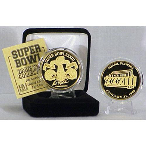 The Highland Mint presents the 24kt Gold Super Bowl XXXIII flip coin. THESE UNIQUE GAME COINS COMMEMORATE EACH INDIVIDUAL SUPER BOWL PLAYED! THE COIN IS INDIVIDUALLY NUMBERED AND FEATURES THE SUPER BOWL LOGO FOR THAT YEAR AS WELL AS THE LOCATION AND DATE OF THE GAME. Each Minted coin is triple struck to feature the finest detail. Made of 24kt Gold overlay the coin combines a beautiful mirrored and frosted finish. Each coin measures 1.5in diameter presented in a capsule to preserve its Mint condition. It is then displayed in a black velour jewelry box includes a Certificate of Authenticity. Is limited to 5000 for each year and is officially licensed by the NFL.