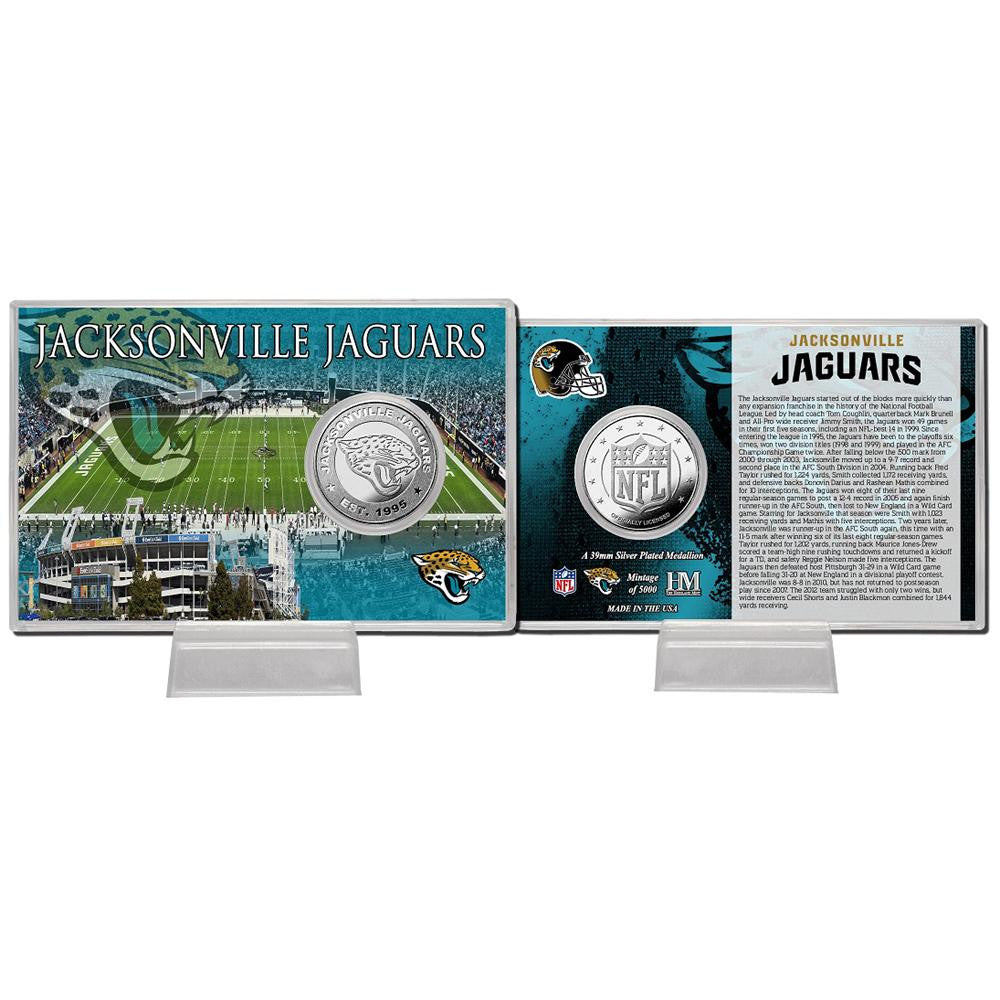 A 39mm Minted Silverplate Coin is featured in a 4in x 6in Acrylic display with printed color graphics of EverBank Field and delivered with a display stand! Officially Licensed by NFL and proudly made in the USA by The Highland Mint!
