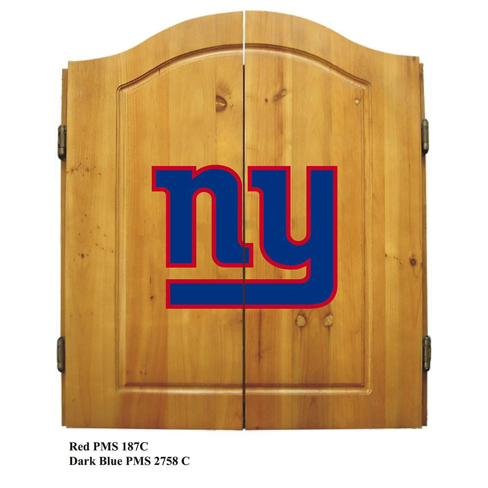 The NFL Dart Board Cabinet Set is a great gift idea to give to a sports fan. It comes with all the equipment needed to play the game of darts. It features a beautiful wood cabinet that displays a large team logo right on the center of doors, contains 6 NFL steel tip darts so you can play against another team, a regulation size bristle dart board and 2 scoreboards with chalk and eraser so you can keep score. Enjoy the game of darts with family and friends before or after a game and represent your favorite team with the officially licensed NFL Dartboard Cabinet Set. Dart Set Includes: Solid Pine Cabinet with Large Silk Screened Team Logo on Doors, 3 Black, 3 Silver Darts with Team Name Printed on Barrels and NFL League Flights, Regulation Size Bristle Dart Board, 2 Scoreboards on Each Inner Door with Small Team Logos Printed on Top Chalk and Eraser and Mounting Hardware Included. Cabinet Dimensions: 25 1/4 L X 21 1/2 W X 3 5/8 D