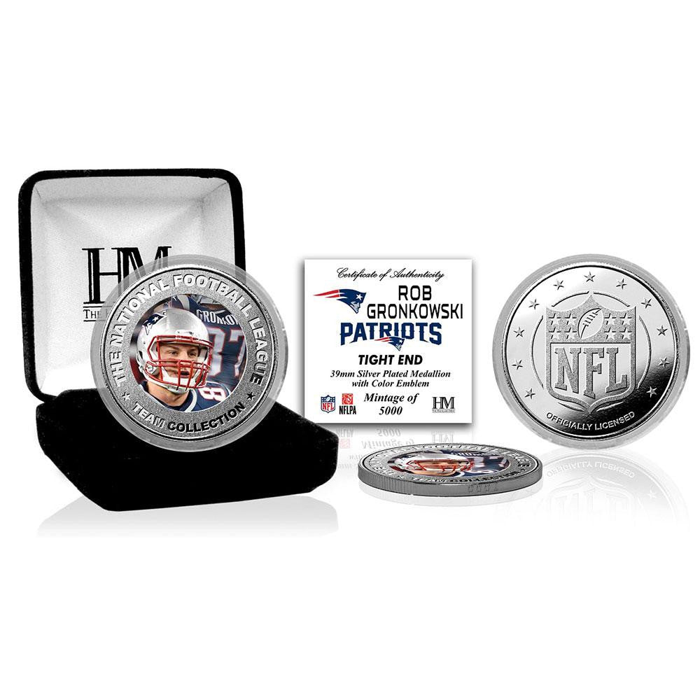 Limited edition! Rob Gronkowski's color image is embedded in the center of this 39mm minted commemorative coin. Each silver plated coin is protected in a clear capsule to preserve its condition and delivered in a black velour jewelry display box. A limited edition of only 5000 each mint coin is individually struck with a serial number on its edge and accompanied by a certificate of authenticity. It is officially licensed by the NFL and NFLPA and proudly made in the USA by The Highland Mint.
