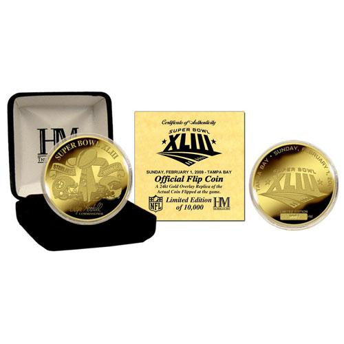 The Highland Mint is exclusively commissioned by the NFL to mint the Super Bowl XLIII Flip Coin so the game does not start without us! Each 24KT Gold overlay Super Bowl Commemorative Flip Coin is minted from the same dies that struck the Official Flip coin used for the Super Bowl inCoin Tossin. Each 24KT Gold Coin measures 1.5 in diameter and is triple struck to the highest standards in minting tradition. This is the only coin licensed to be minted with the prestigious Vince Lombardi Trophy and it features the dueling helmets of the Super Bowl teams on either side! The reverse of the Commemorative Flip Coin features the Official Super Bowl XLIII logo with the location and date of the game listed on the perimeter. Furthermore each coin is individually numbered giving each coin its uniqueness! The coin measures 1.5 in diameter and each is protected in a capsule to preserve its condition and delivered in a 2.5in x 2.5in black velour collector?s box with a Certificate of Authenticity. This
