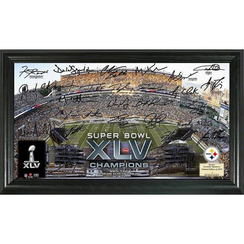 Featured in a 12in x 20in wood frame are the facsimile (exact replica) signatures of the Super Bowl XLV Champs spread out on a 10?x18? glossy image of their home field and each is individually numbered.e Protected under plexi glass this item is a Limited Edition of only 2010 and officially licensed by the NFL and NFLPA