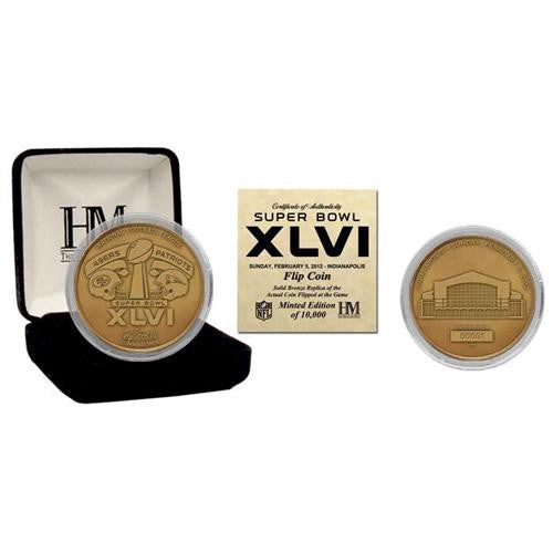 The Highland Mint is proud to present the Bronze Super Bowl XLVI Flip Coin. This is a Bronze replica of the Coin used on the field to start the game! Featured on the front is the Vince Lombardi Trophy as well as the Super Bowl teams helmets. The reverse is minted with the Super Bowl XLVI Logo Date Location and space where each is struck with its individual serial number. Each 1.5 inch diameter bronze Flip Coin is protected in an acrylic capsule to preserve its condition and presented in a custom 2.5in x 2.5in jewelry case. A Certificate of Authenticity numbered to match the number on the Coin is included. Limited Mintage of only 10000 and officially licensed by the National Football League. Proudly made in the U.S.A.
