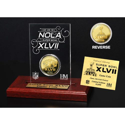 Limited Edition of 10000!e A 24KT Gold flashed replica Super Bowl Flip Coin is beautifully displayed in a 3.5in x 5in Acrylic with custom Super Bowl XLVII Etching (Engraving). Each is delivered with a cherry wood base with an engraved nameplate as well as a Certificate of Authenticity. A Limited Edition of 10000 and Officially Licensed by the National Football League. Proudly made in the U.S.A. by The Highland Mint!