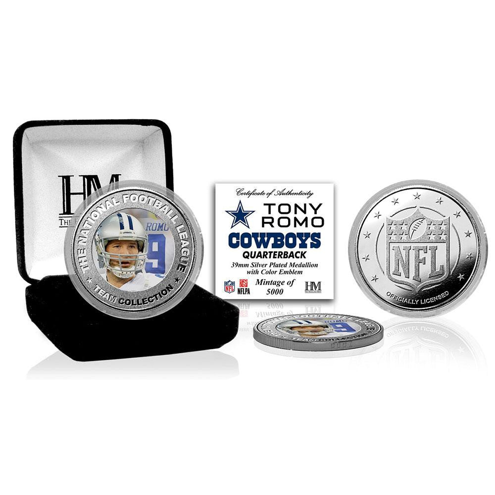Limited edition! Tony Romo's color image is embedded in the center of this 39mm minted commemorative coin. Each silver plated coin is protected in a clear capsule to preserve its condition and delivered in a black velour jewelry display box. A limited edition of only 5000 each mint coin is individually struck with a serial number on its edge and accompanied by a certificate of authenticity. It is officially licensed by the NFL and NFLPA and proudly made in the USA by The Highland Mint.