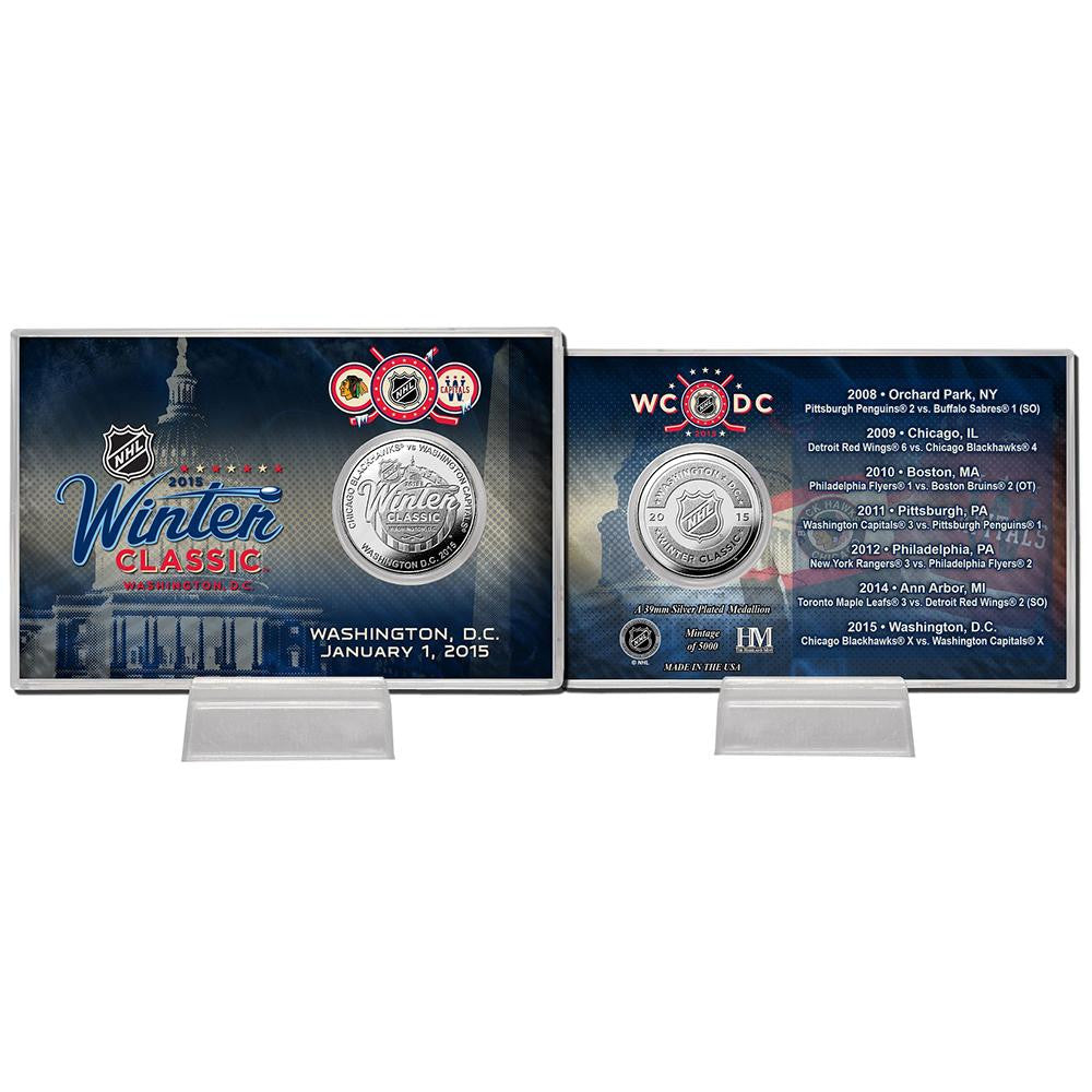 Featured in a 4in x 6in acrylic coin holder is a minted 39mm Silver plate 2015 Winter Classic commemorative game coin as well as color graphics featuring an image commemorating the Winter Classic in Washington DC as well as the Winter Classic historical timeline. Each coin card is delivered with a custom display stand.A limited edition 5000 and officially Licensed by the NHL. Proudly Made in the U.S.A!