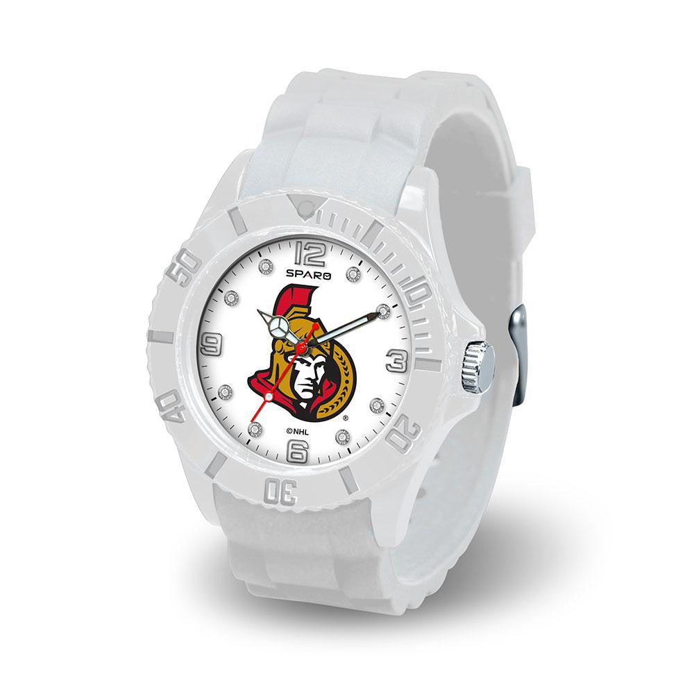 The Sparo Cloud Watch has a supple rubber sports strap with a sports buckle. Scratch resistant mineral crystal lens. Precision quartz movement. Silver numbers and florescent hands make it easy to read. The back is stainless steel and the watch is water/shock resistant up to 2 ATM's. Limited Lifetime Warranty. Officially licensed team logos and colors.