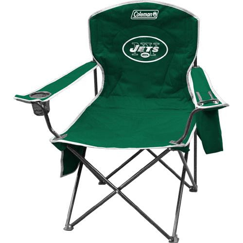 Never leave your chair at your next tailgate or backyard party with this Coleman NFL Cooler Quad Chair. Features screenprint team logo on front and back, a cooler built into armrest which holds 3-4 cans, built in mesh cup holder and hanging storage pocket, oversized chair includes padding for extra comfort, a reinforced steel frame with a 300 lb. weight rating, and comes with team logo carry case ? Dimensions: 36? x 24? x 40? tall
