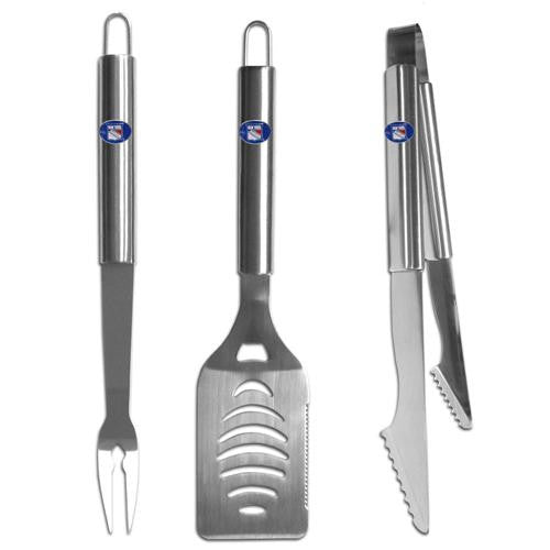 Our officially licensed NHL Rangerse stainless steel 3 pc BBQ tool set includes a large spatula with built in bottle opener, heavy duty tongs, and large fork. All the tools feature a team logo on the handle.