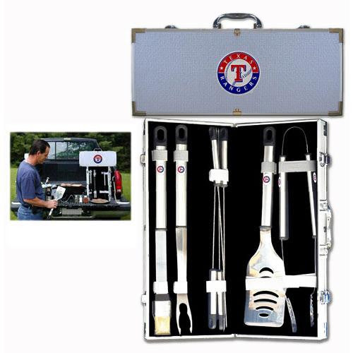Our MLB 8 pc BBQ set includes a spatula with knife edge, grill fork, tongs, basting brush and 4 skewers. The tools are approximately 19 long and have sturdy stainless steel handles. The aluminum carrying case features a metal carved emblem with enameled finish.